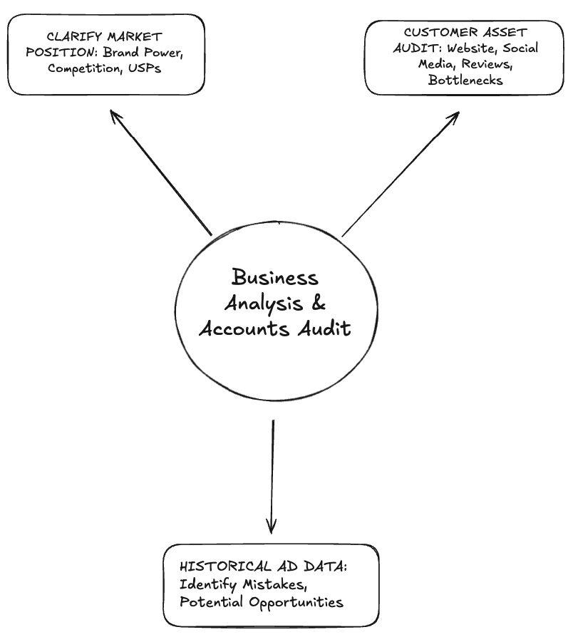 To find the biggest opportunities for growth, we analyze your entire business landscape. We start by clarifying your market position (brand power, competition, USPs). Then, we audit your customer-facing assets—like your website, social media, and reviews—to pinpoint any bottlenecks that are holding back profit. If you are already running ads, we proceed with an extensive audit of the historical data of the account to identify mistakes and potential opprtunities for better performance.